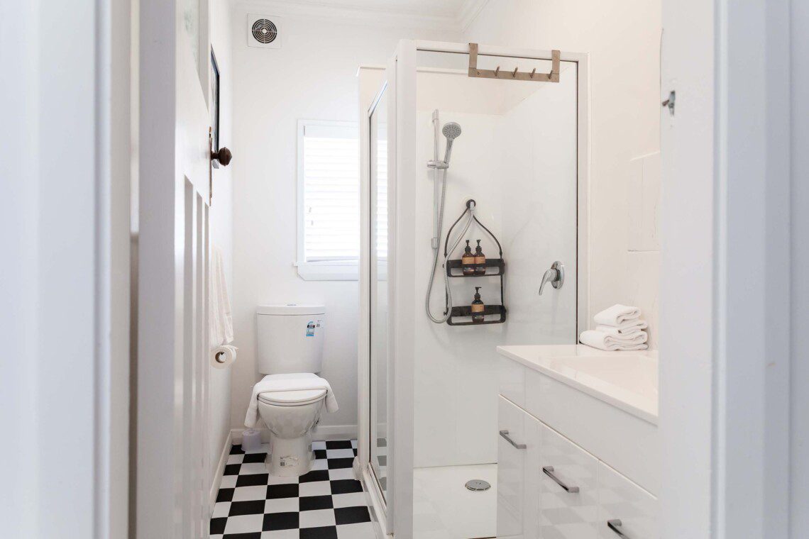 The central bathroom includes a modern shower and toilet.