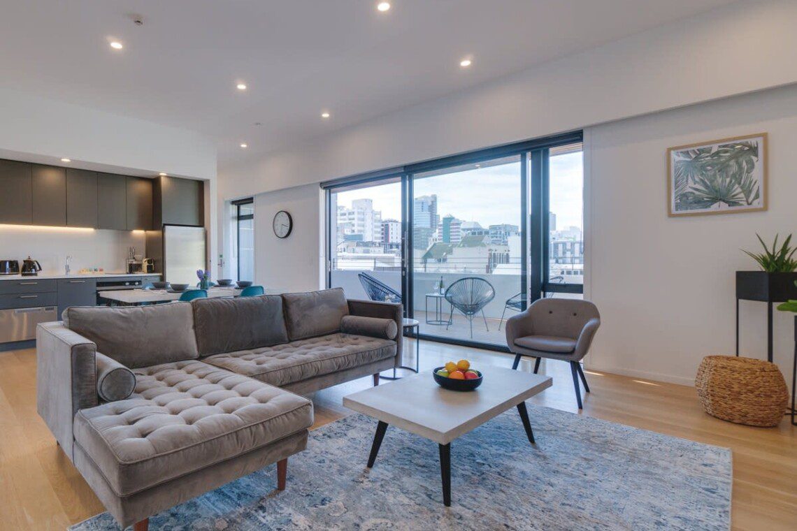 The open plan living room is the perfect space to relax, with modern furniture and plenty of natural light thanks to the large sliding glass doors. Curl up on the comfortable L-shaped sofa after a busy afternoon on Cuba St.